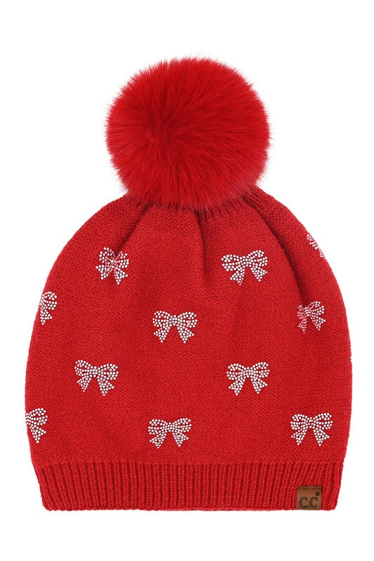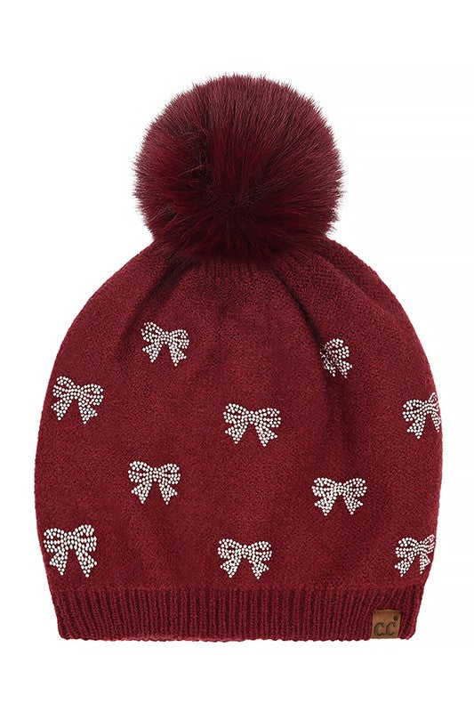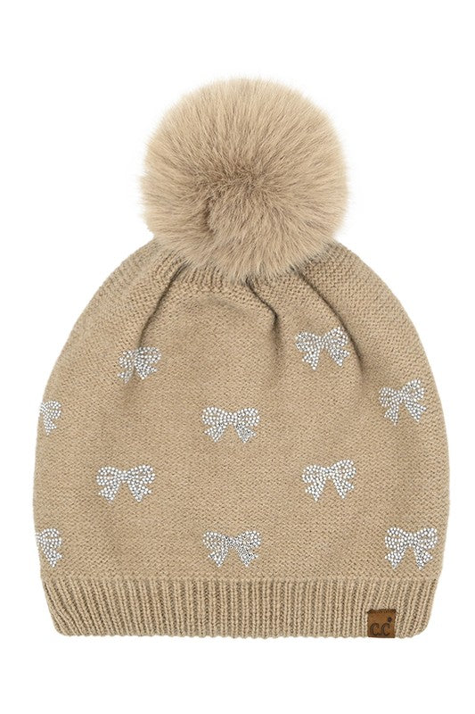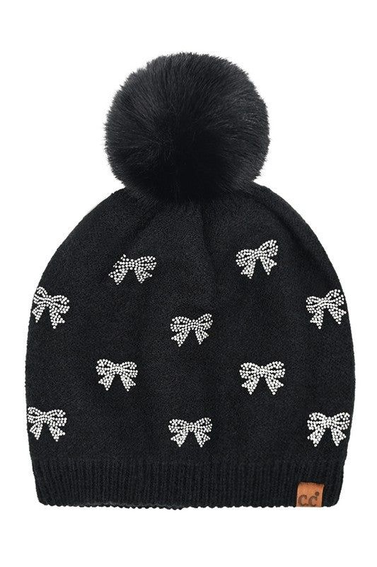 C.C. Allover Rhinestone Mini Bow Pom Beanie