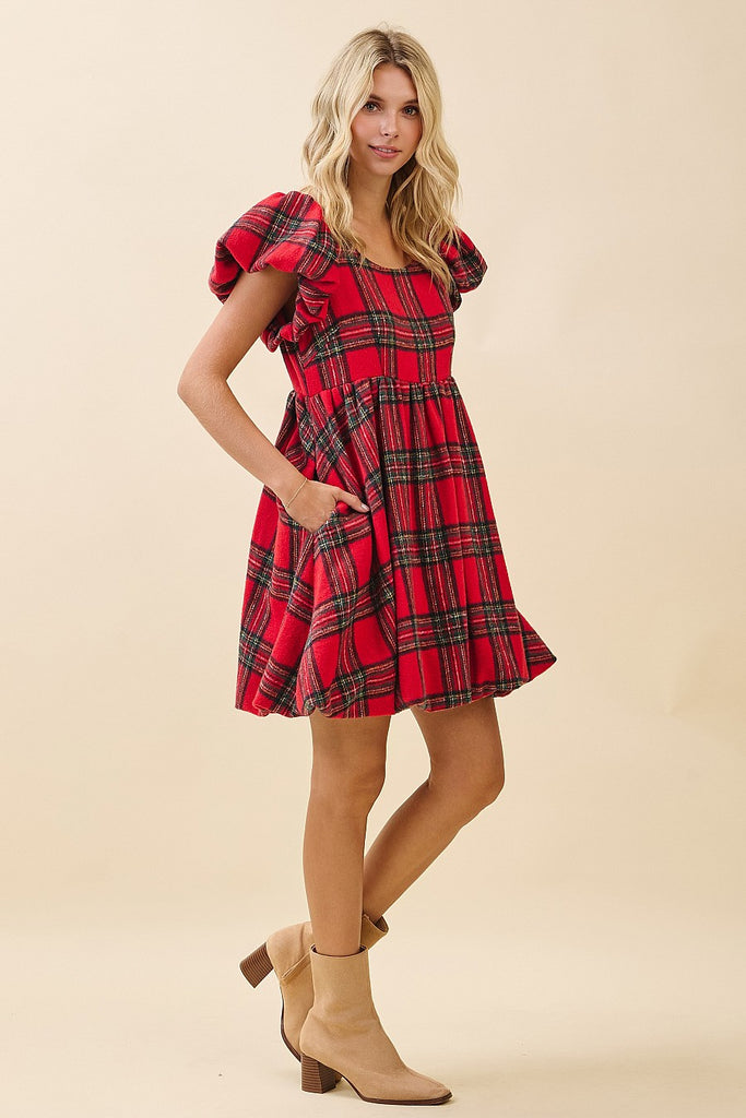 Turn heads this season in our Christmas Plaid Bubble Dress—a playful twist on holiday style! This charming dress features a classic plaid pattern with a fun bubble silhouette that's both flirty and flattering. Sweet puff sleeves add a touch of whimsy, while practical pockets keep your essentials close. The adjustable back tie lets you customize your fit and creates an adorable detail when tied. Perfect for festive gatherings, casual holiday outings, or any time you want to add a dash of seasonal personality to your everyday look, this contemporary dress proves that holiday fashion can be both stylish and seriously fun.