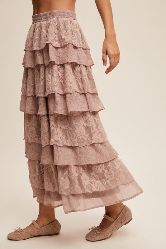 Twirl into elegance with this light mocha maxi skirt, made from delicate all-over floral lace. The tiered ruffles add playful volume and a graceful flow, while the elasticized waistband ensures a comfy, secure fit all day long. Fully lined for comfort and modesty, this flowy skirt is perfect for weddings, special occasions, or simply adding a dose of drama to your everyday style. Pair it with a fitted top or cozy sweater to complete your look.