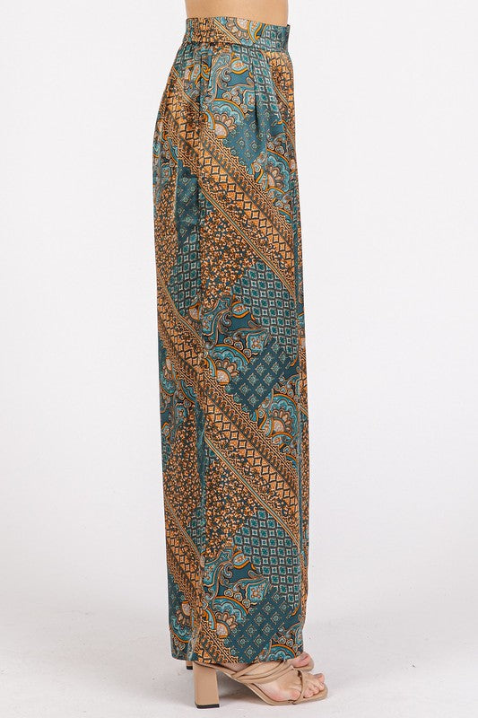 Step into effortless elegance with these paisley patchwork satin pants. The eye-catching print pairs perfectly with the luxe woven fabric, while the relaxed fit and semi-wide leg create a flattering silhouette that moves with you. A front banded waist with pleated detailing adds dimension, and the elastic back ensures all-day comfort. Practical side pockets and pull-on styling make getting dressed a breeze. Full length and ready to impress, these beauties are the perfect match for the coordinating top—or style them solo for instant sophistication.
