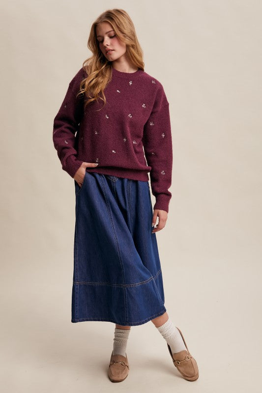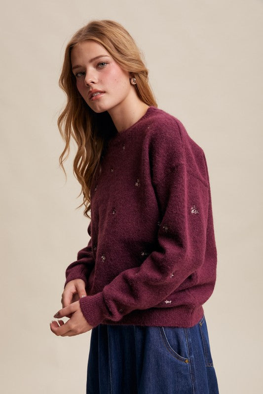 Plum Embroidered Floral Knit Sweater