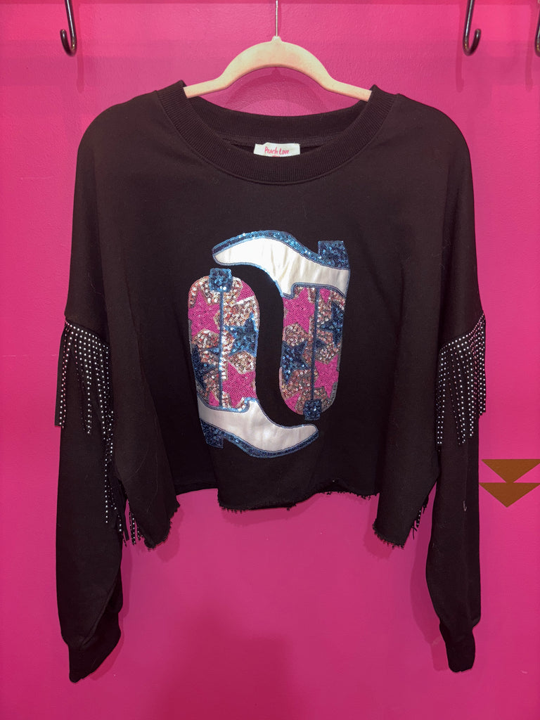 Sparkle and shine in this playful sweatshirt that brings the fun! Featuring eye-catching sequin star boots patchwork across the front, studded fringe adorning the sleeves, and a trendy crop fit that's perfect for showing off your style. Crafted from a comfortable cotton-polyester blend (60% cotton, 40% polyester), this piece is soft enough for all-day wear while the fun details make it a standout favorite. Whether you're dressing up for a night out or adding personality to your casual wardrobe, this sweatshirt delivers bold, whimsical charm.