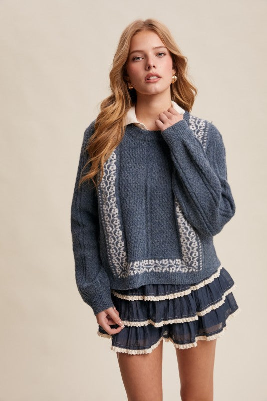 Wrap yourself in effortless style with this textured crewneck sweater that's equal parts cozy and chic. Crafted from soft, plush knit fabric with intricate jacquard panels for visual interest, it's the kind of piece that feels as good as it looks. The relaxed fit and dropped shoulders create that perfect laid-back vibe, while ribbed trim at the hem, cuffs, and neckline keeps everything polished. Layer it over a crisp button-up, throw it on with your favorite jeans, or pair it with a skirt—this versatile sweater is ready for whatever your day brings. Classic crew neck, endless possibilities.
