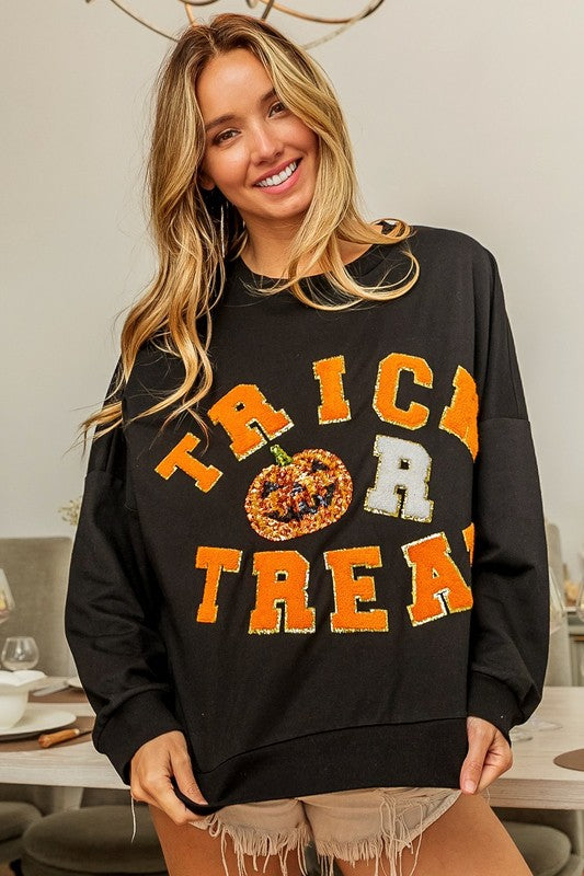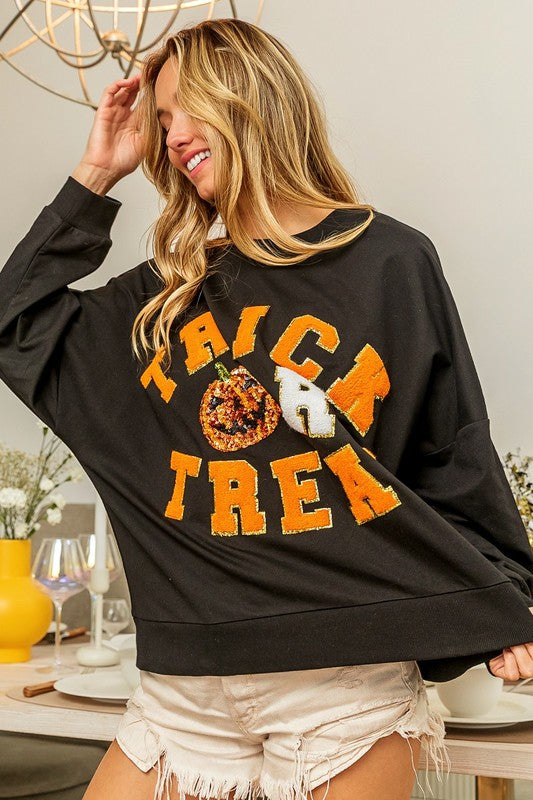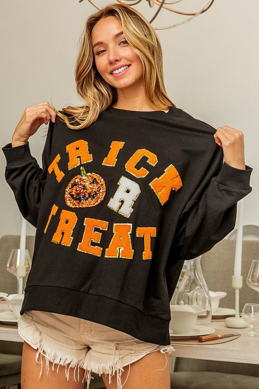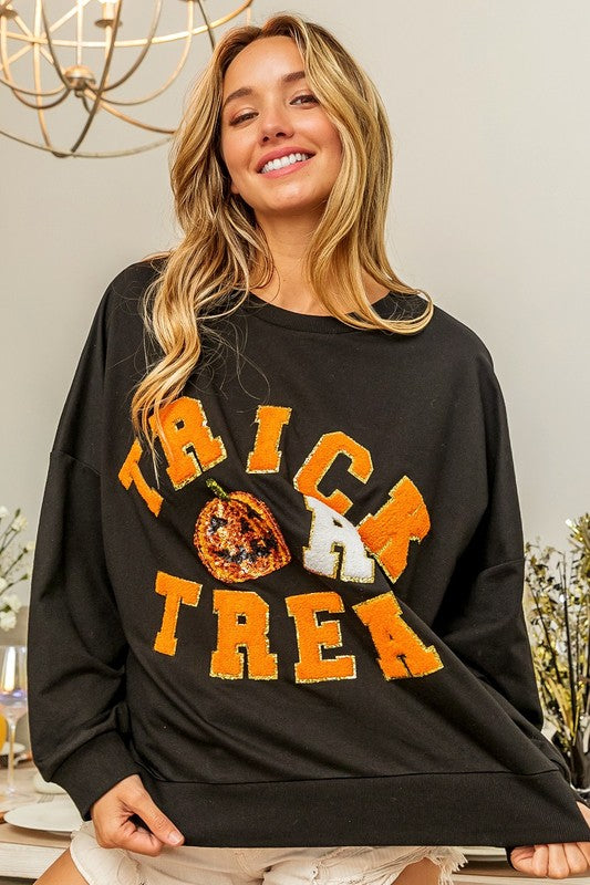 Cozy up in this super soft Trick Or Treat Sequin & Applique Sweatshirt! Its fun applique lettering and sparkling sequin pumpkin design add the perfect touch of festive flair. With an oversized fit, it’s your go-to for playful comfort all season long.