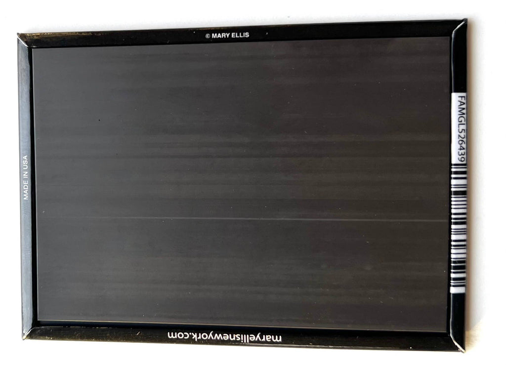 3.5" x 2.5" metal magnet mini painting of Mary's Chicago Skyline. Glossy finish and strong full magnetic backing.